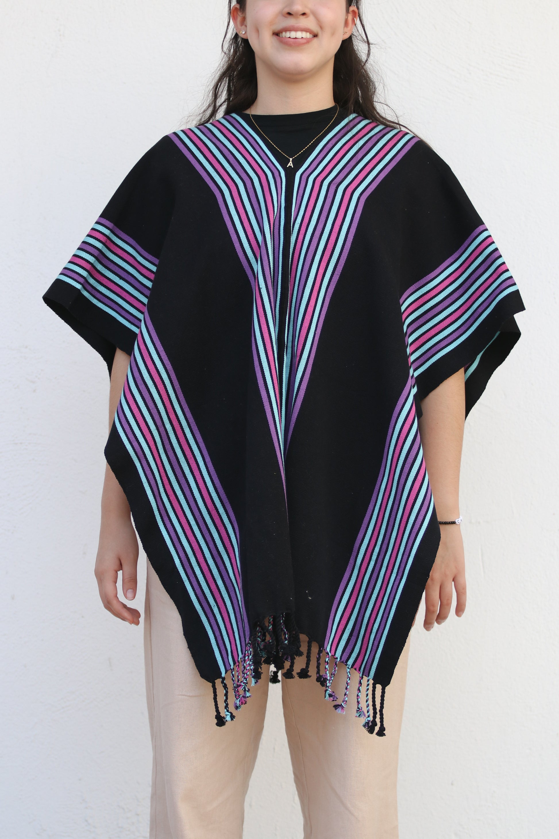 Black poncho with purple and blue stripes made by Victoria